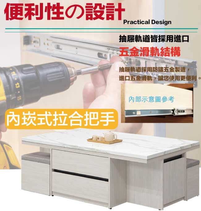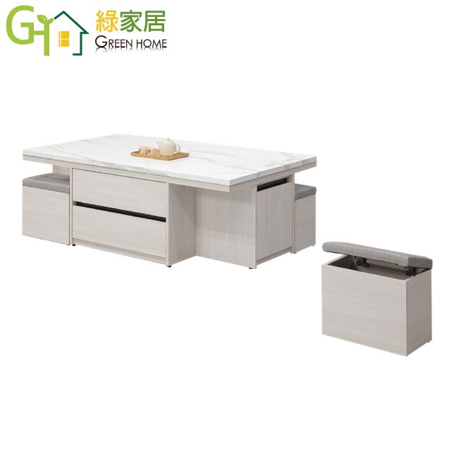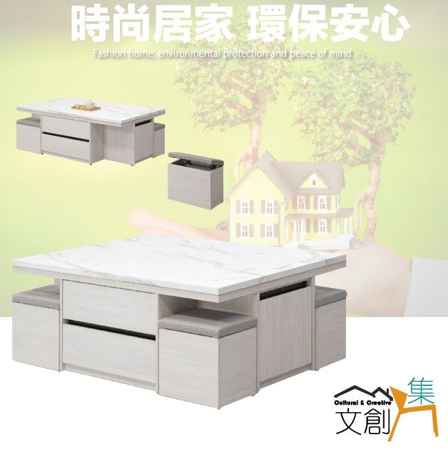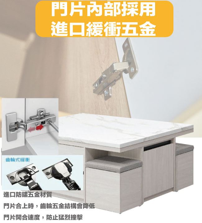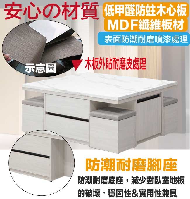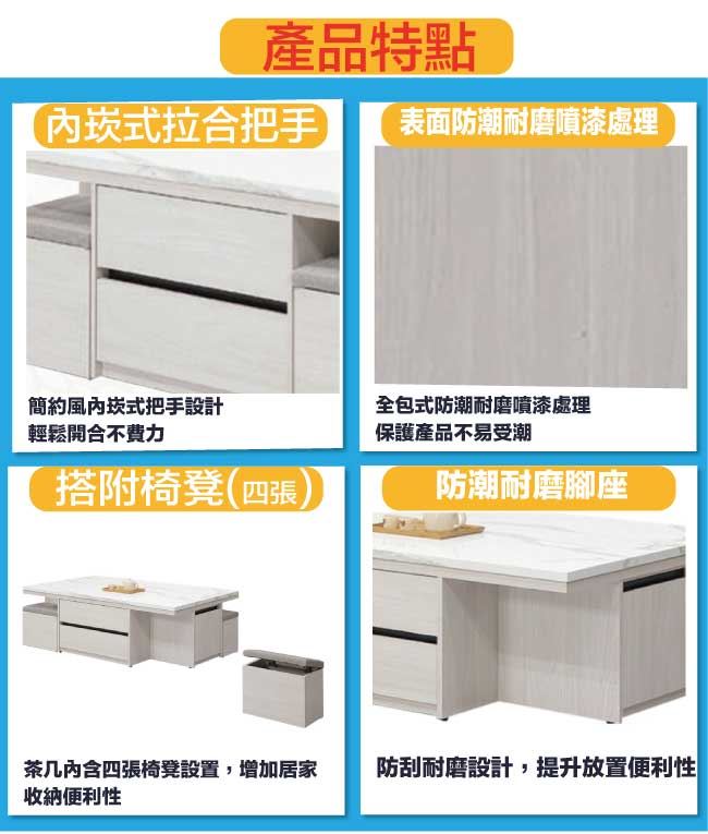 商 品 介 紹 | 【綠家居】卡奇里5尺白榆木紋雙面開門二抽大茶几(附收納椅凳四張) 白榆木紋色系+現代簡約風格+安心材質製造,整體採用防蛀木心板+防潮MDF纖維板(桌面板材質)+防潮耐磨腳座+五金滑軌結構+仿雲紋石面紋路木質桌面板+防夾手緩衝門片五金等安心材質製造,產品外層採用防潮耐磨噴漆處理搭配採用雙面開合開門櫃+二抽屜+內開放層格+附收納椅凳四張等收納空間設計,全由專人配送到家,專業安心服務,替你省下更多時間! 【商品特色】 白榆木紋色系+現代簡約風格+安心材質製造,使用放心+搭配居家更便利 採用防蛀木心板+防潮MDF纖維板(桌面板材質)+防潮耐磨腳座+五金滑軌結構+仿雲紋石面紋路木質桌面板+防夾手緩衝門片五金等安心材質製造 產品外層採用防潮耐磨噴漆處理 搭配採用雙面開合開門櫃+二抽屜+內開放層格+附收納椅凳四張等收納空間設計 此商品不需要DIY組立,此商品為組立後之成品 全由專人配送到家,專業安心服務,替您省下更多時間