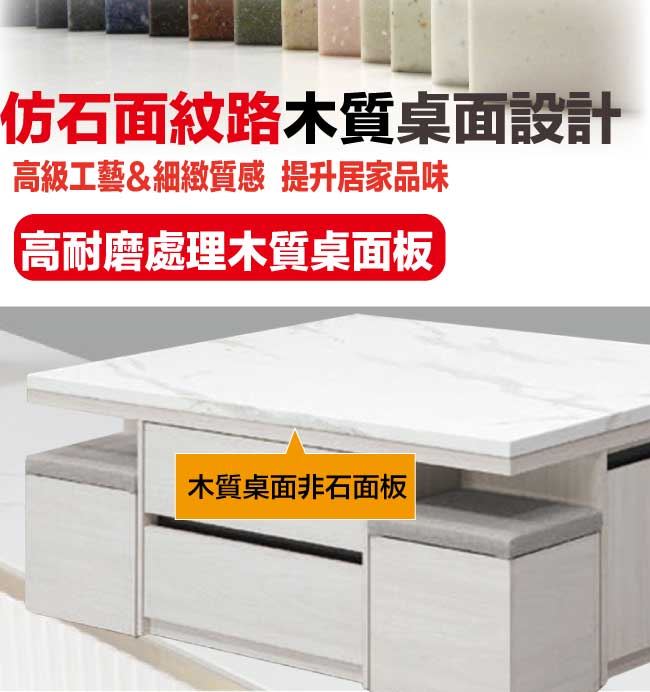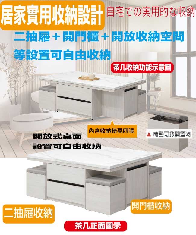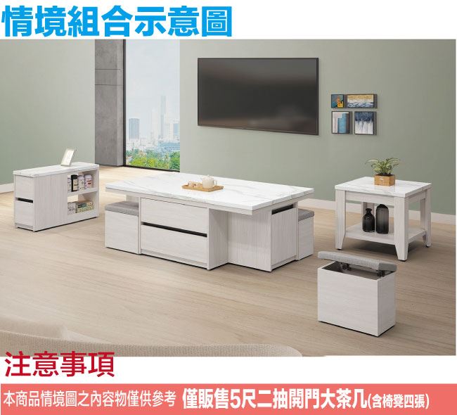 【綠家居】卡奇里5尺白榆木紋雙面開門二抽大茶几(附收納椅凳四張)