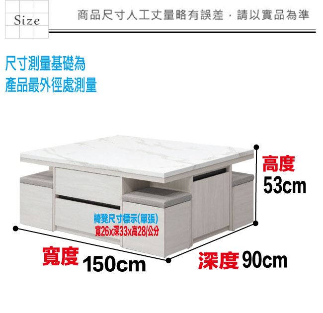 材質 | ◆產品名稱:【綠家居】卡奇里5尺白榆木紋雙面開門二抽大茶几(附收納椅凳四張) 尺寸:(寬)150x(深)90(高)53/公分 ◆材質: 材質:防蛀木心板+防潮MDF纖維板材(桌面板材質)+防潮耐磨腳座+五金滑軌結構+仿雲紋石面紋路木質桌面板+防夾手緩衝門片五金 噴漆:防潮耐磨噴漆處理 |