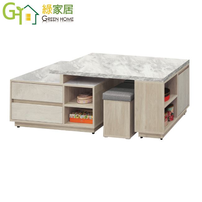 【綠家居】柏森4尺雙面四抽可伸縮大茶几(附收納椅凳二張)