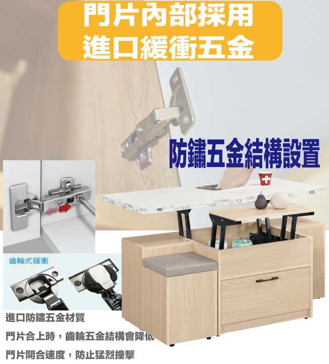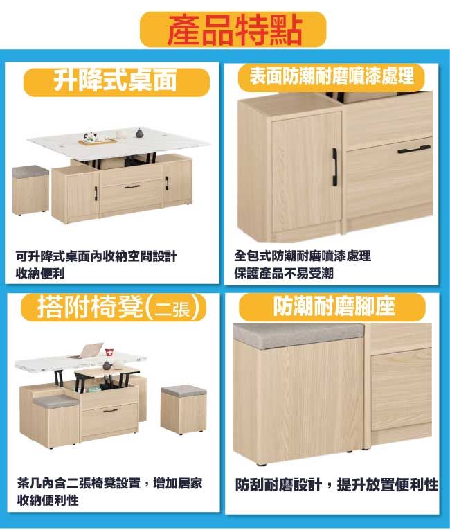 商 品 介 紹 | 【綠家居】維爾4尺升降機能大茶几(附贈可收納椅凳二張) 木紋雙色系+現代簡約風格+安心材質製造,整體採用防蛀木心板+防潮耐磨底座+仿石紋美耐皿桌面板+五金滑軌結構&升降五金結構等安心材質製造,產品外層採用防潮亮面噴漆處理搭配採用單抽屜+開放&隱藏式收納+附贈可收納椅凳二張等收納空間設計,全由專人配送到家,專業安心服務,替你省下更多時間! 【商品特色】 木紋雙色系+現代簡約風格+安心材質製造,使用放心+搭配居家更便利 茶几桌面板可升降設計,讓您可依據實際使用狀況調整高度及桌面寬度,提升居家便利性 採用防蛀木心板+防潮耐磨底座+仿石紋美耐皿桌面板+五金滑軌結構&升降五金結構等安心材質製造 搭配採用單抽屜+開放&隱藏式收納+附贈可收納椅凳二張等收納空間設計 此商品不需要DIY組立,此商品為組立後之成品 品質保證、專業設計、貼心服務 全由專人配送到家,專業安心服務,替您省下更多時間
