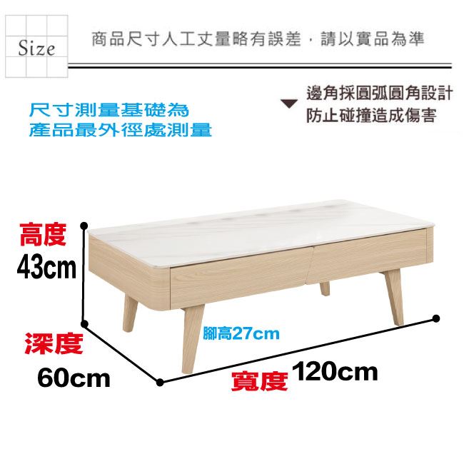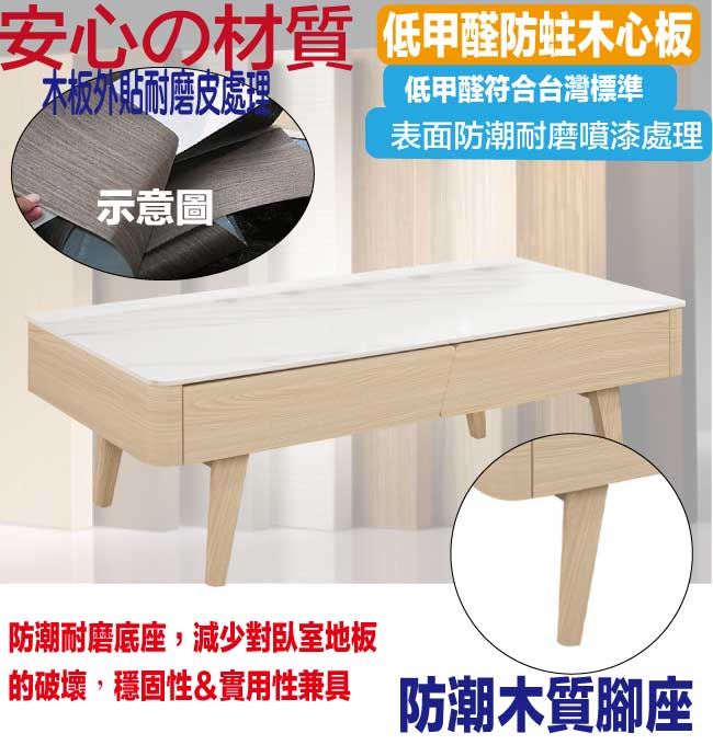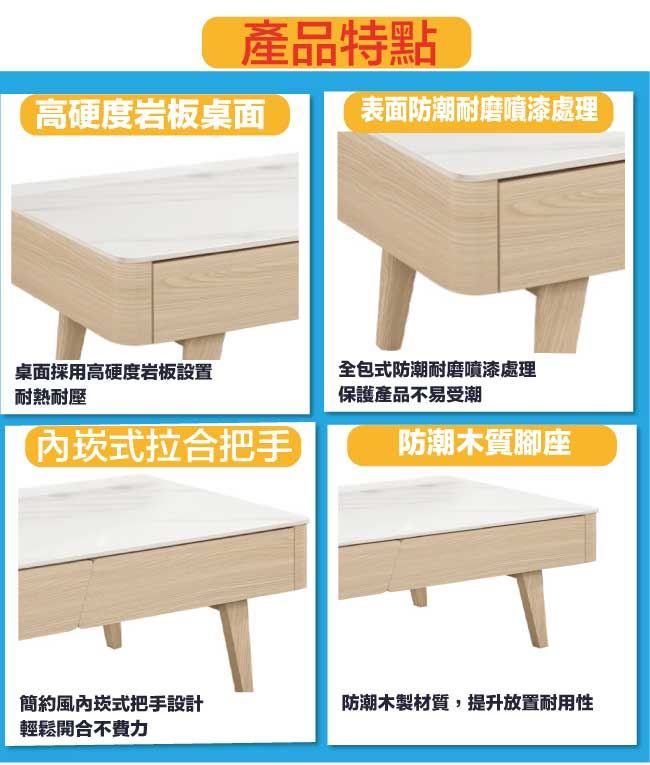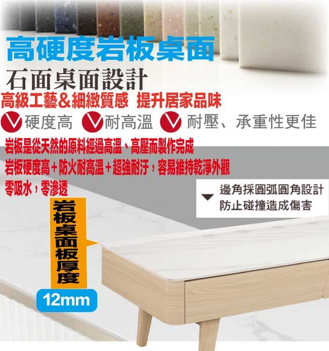 材質 | ◆產品名稱:【綠家居】維爾4尺岩板二抽大茶几 尺寸:(寬)120x(深)60(高)43/公分 ◆材質: 材質:防蛀木心板+防潮木質腳座+12mm高硬度岩板桌面板+五金滑軌結構 表面防潮耐磨噴漆處理 |