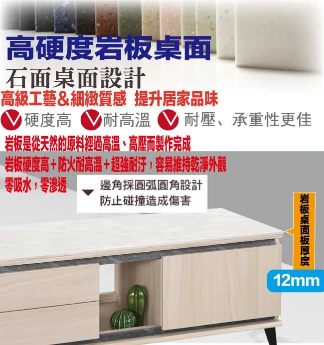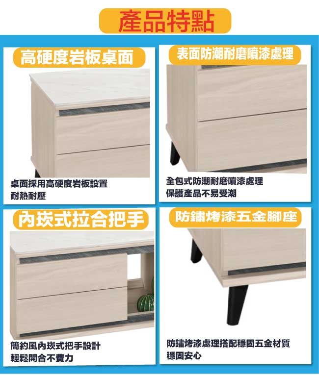 材質 | ◆產品名稱:【綠家居】納莉爾4尺岩板開門四抽大茶几 尺寸:(寬)120x(深)60(高)48/公分 ◆材質: 材質:防蛀木心板+烤漆金屬腳座+12mm高硬度岩板桌面板+五金滑軌結構 表面防潮耐磨噴漆處理 |