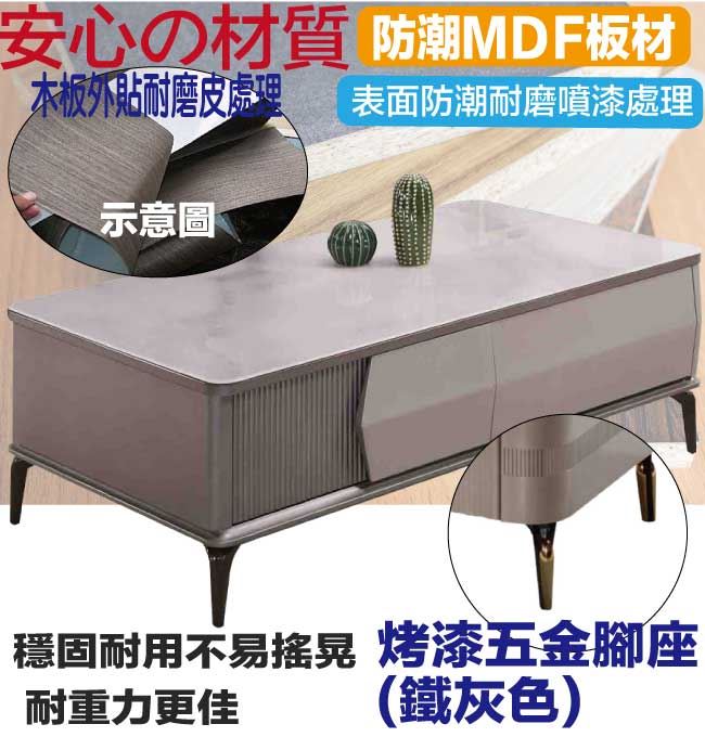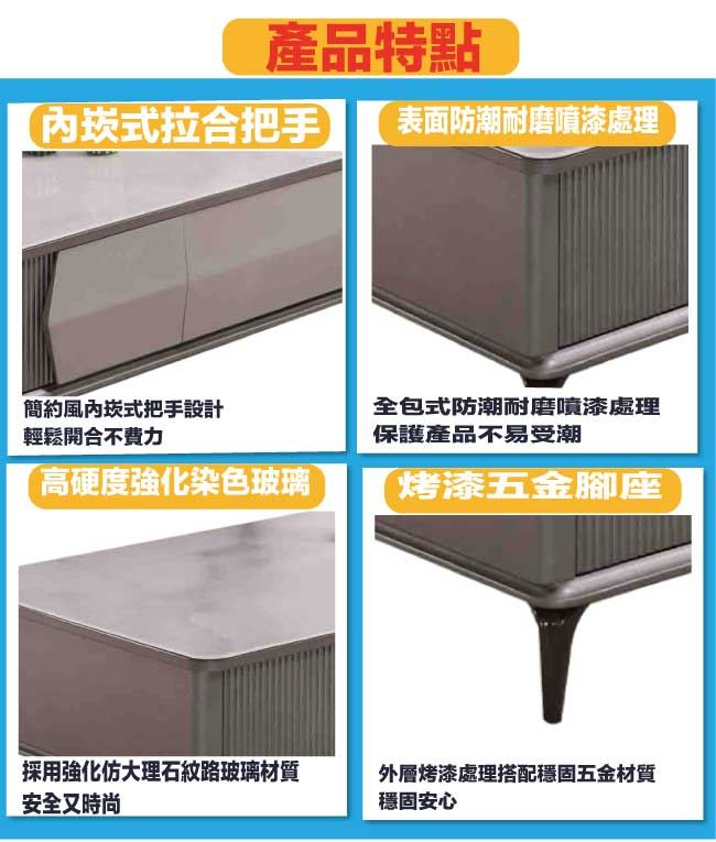 材質 | ◆產品名稱:【綠家居】黛梅4.3尺玻璃四抽大茶几 尺寸:(寬)130x(深)70(高)45/公分 ◆材質: 材質:防潮MDF板+烤漆金屬腳座+5mm仿大理石紋路強化玻璃桌面板+五金滑軌結構 表面防潮耐磨噴漆處理 |