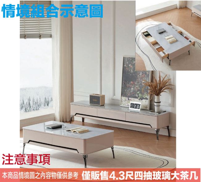 【綠家居】琳諾4.3尺四抽玻璃大茶几