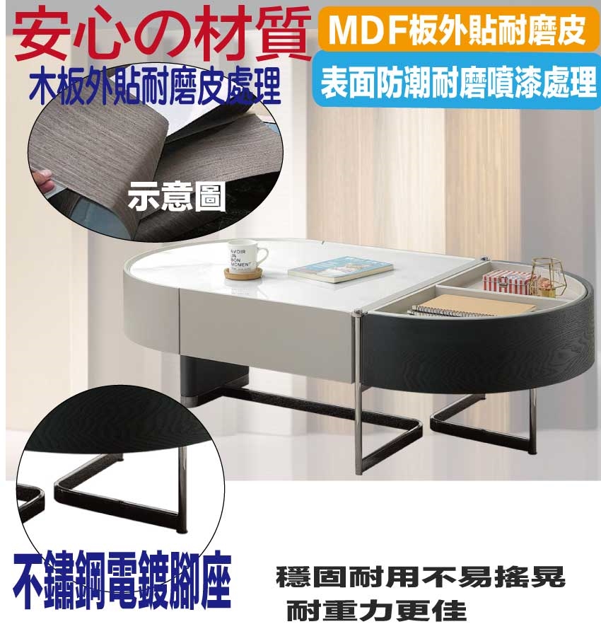 材質:防潮MDF板+不鏽鋼腳座+五金滑軌結構+12mm雲紋石面桌面板
