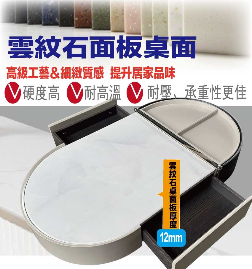 採用防潮MDF板+不鏽鋼腳座+五金滑軌結構+12mm雲紋石面桌面板等安心材質製造