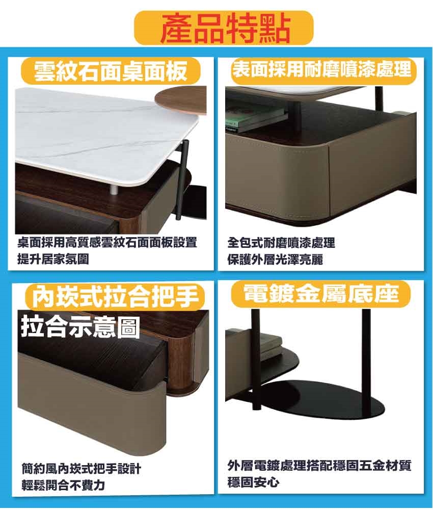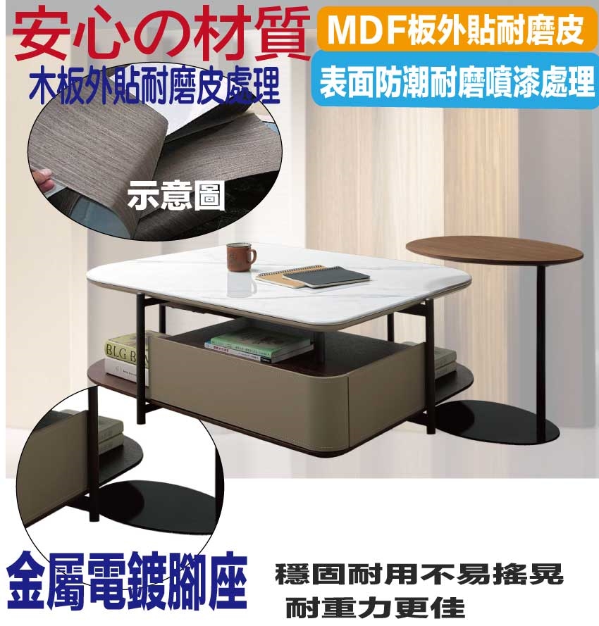 材質:防潮MDF板+金屬電鍍腳座+五金滑軌結構+15mm雲紋石面桌面板