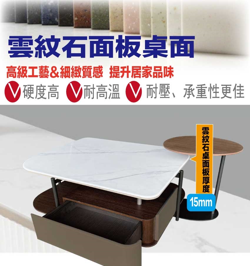 採用防潮MDF板+金屬電鍍腳座+五金滑軌結構+15mm雲紋石面桌面板等安心材質製造