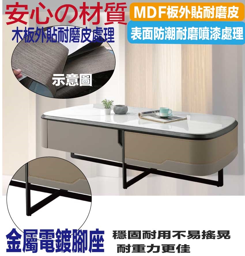 採用防潮MDF板+金屬電鍍腳座+五金滑軌結構+12mm雲紋石面桌面板等安心材質製造