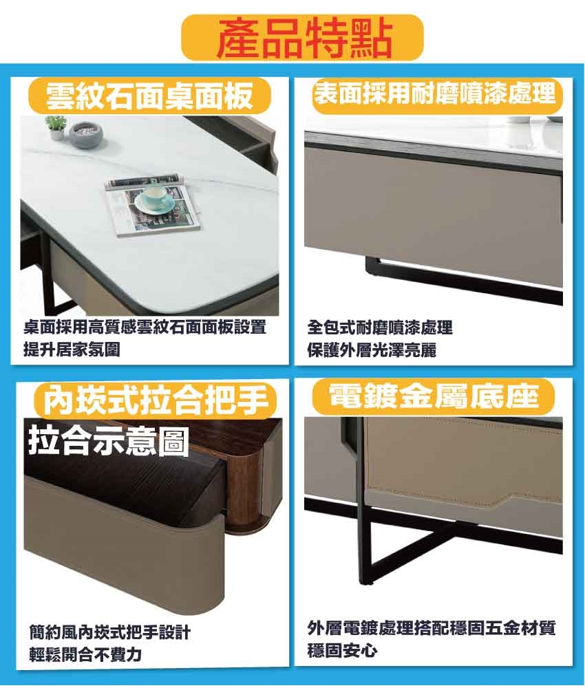 材質:防潮MDF板+金屬電鍍腳座+五金滑軌結構+12mm雲紋石面桌面板