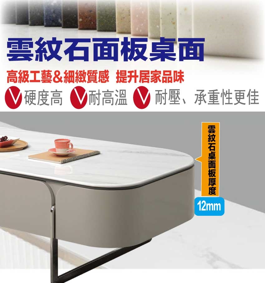 材質:防潮MDF板+金屬電鍍腳座+五金滑軌結構+12mm雲紋石面桌面板