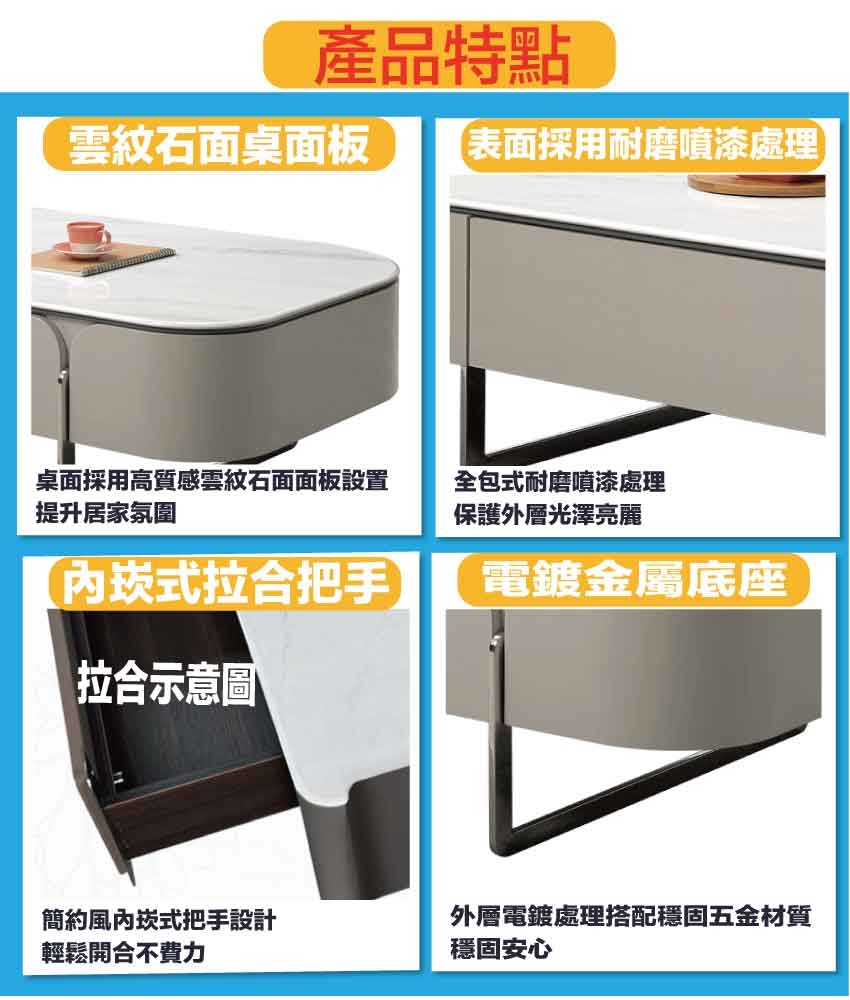 採用防潮MDF板+金屬電鍍腳座+五金滑軌結構+12mm雲紋石面桌面板等安心材質製造