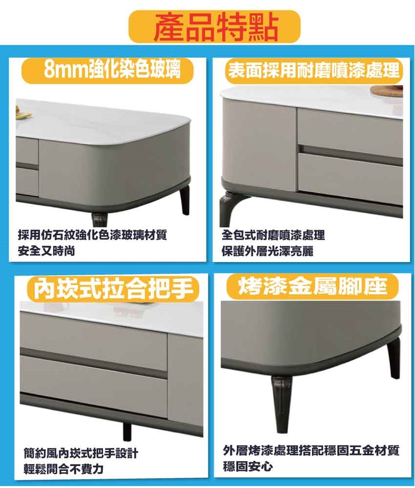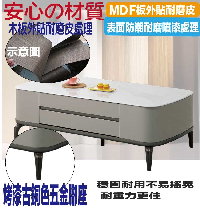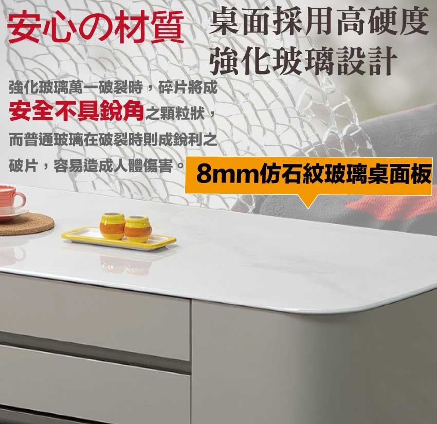 採用防潮MDF板+烤漆五金腳座+五金滑軌結構+8mm仿大理石紋強化玻璃桌面板等安心材質製造
