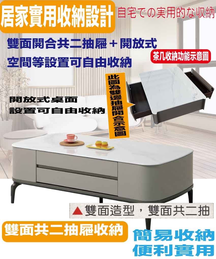 搭配採用雙面開合二抽屜+開放桌面等收納空間設計
