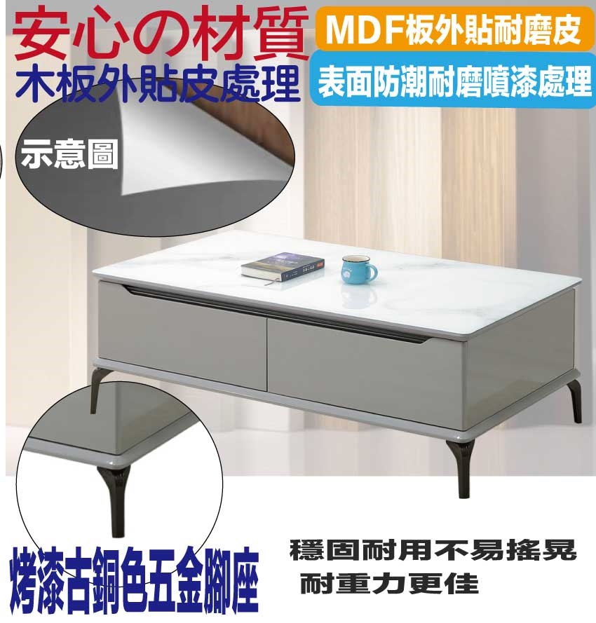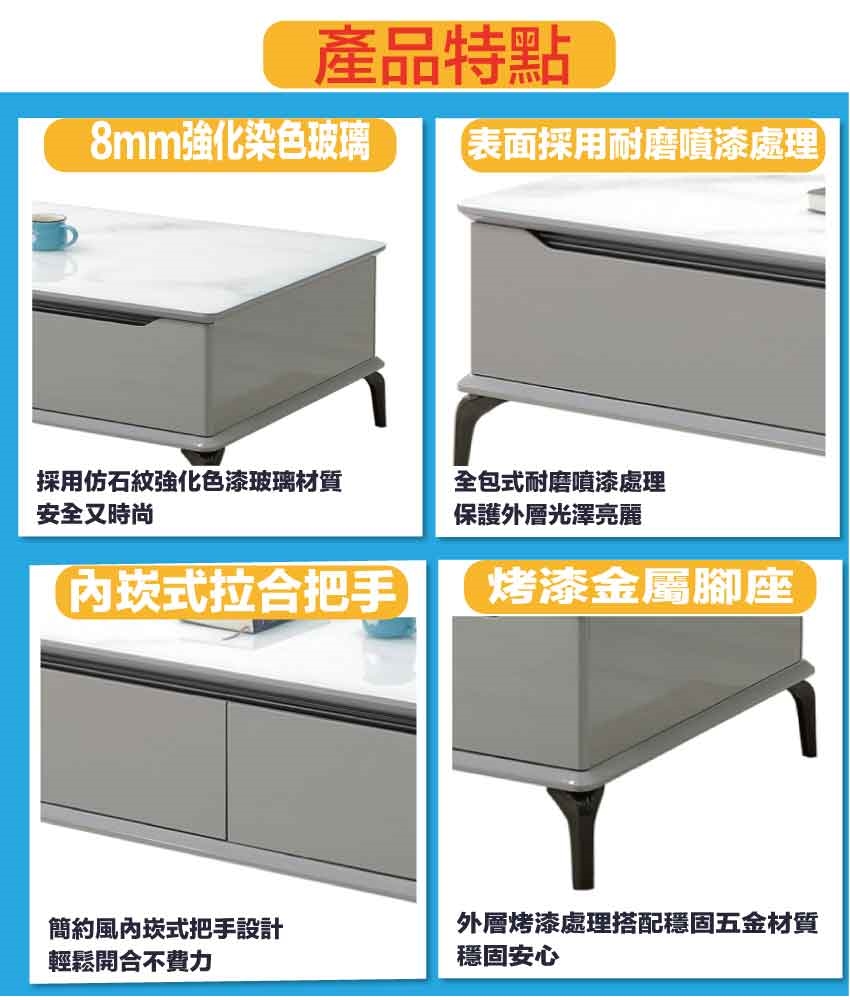 採用防潮MDF板+烤漆五金腳座+五金滑軌結構+8mm仿大理石紋強化玻璃桌面板等安心材質製造