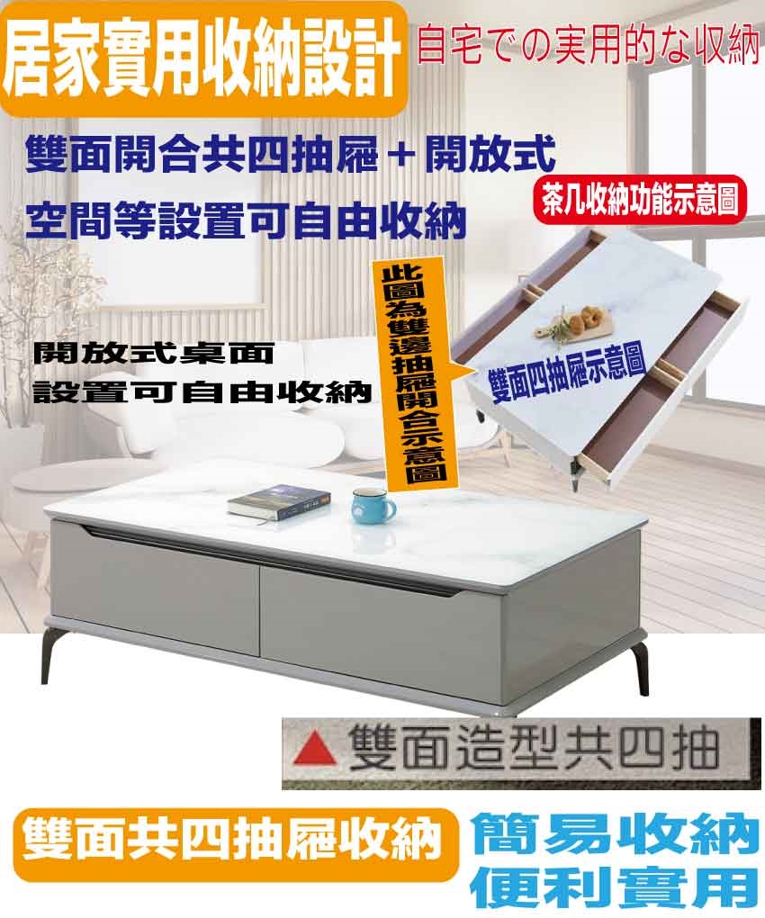 搭配採用雙面開合四抽屜+開放桌面等收納空間設計