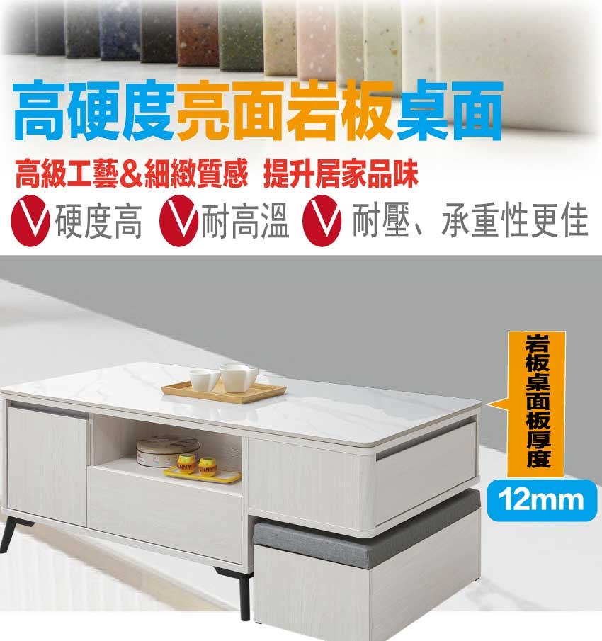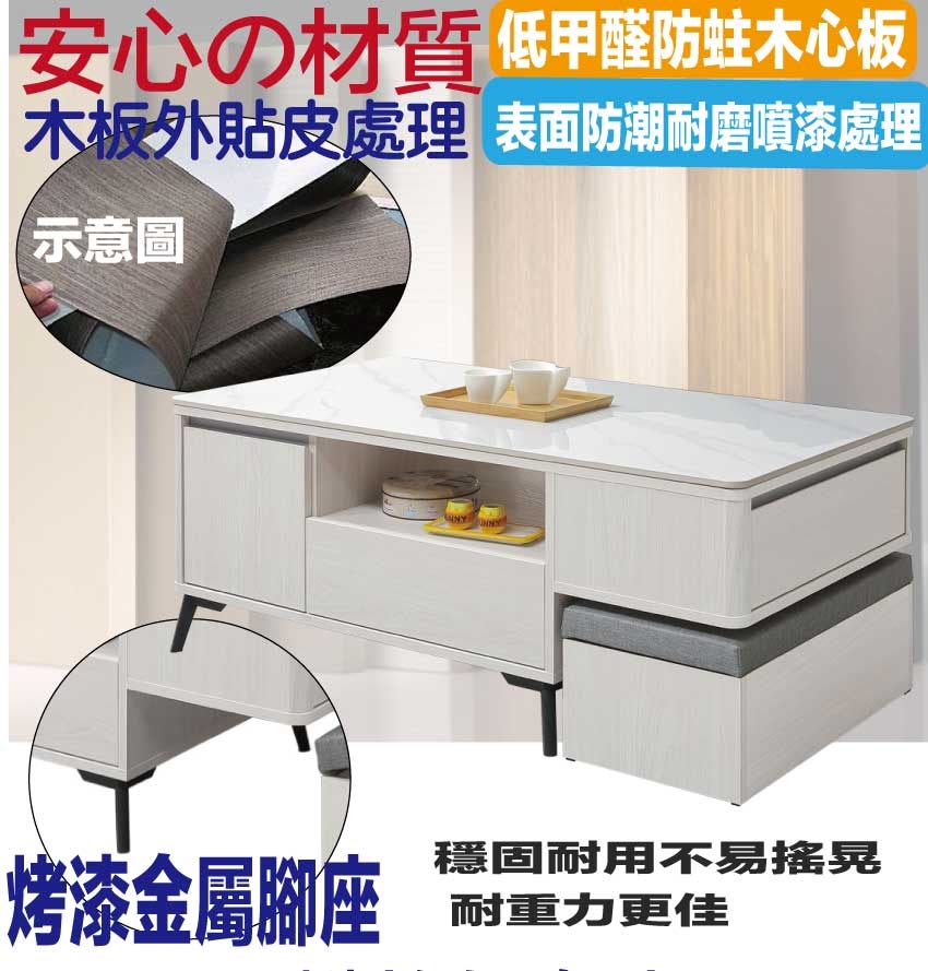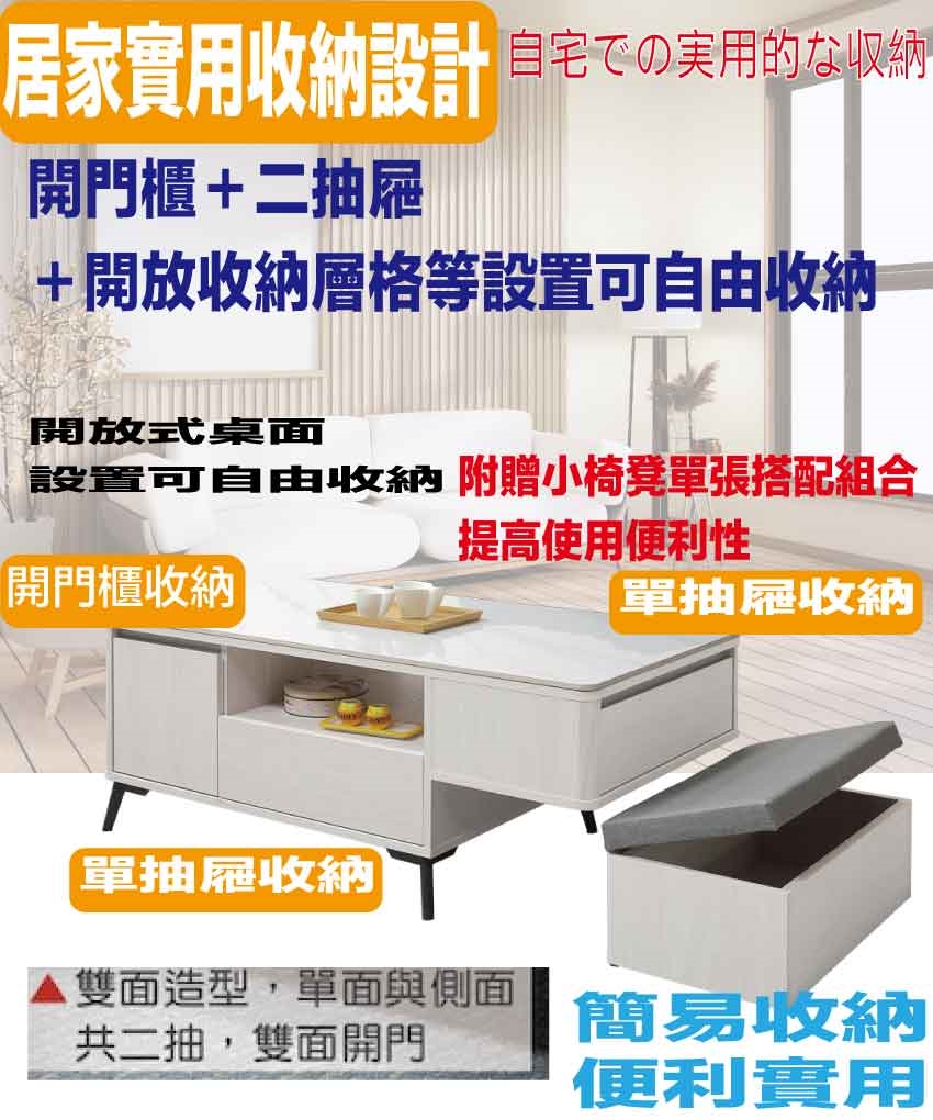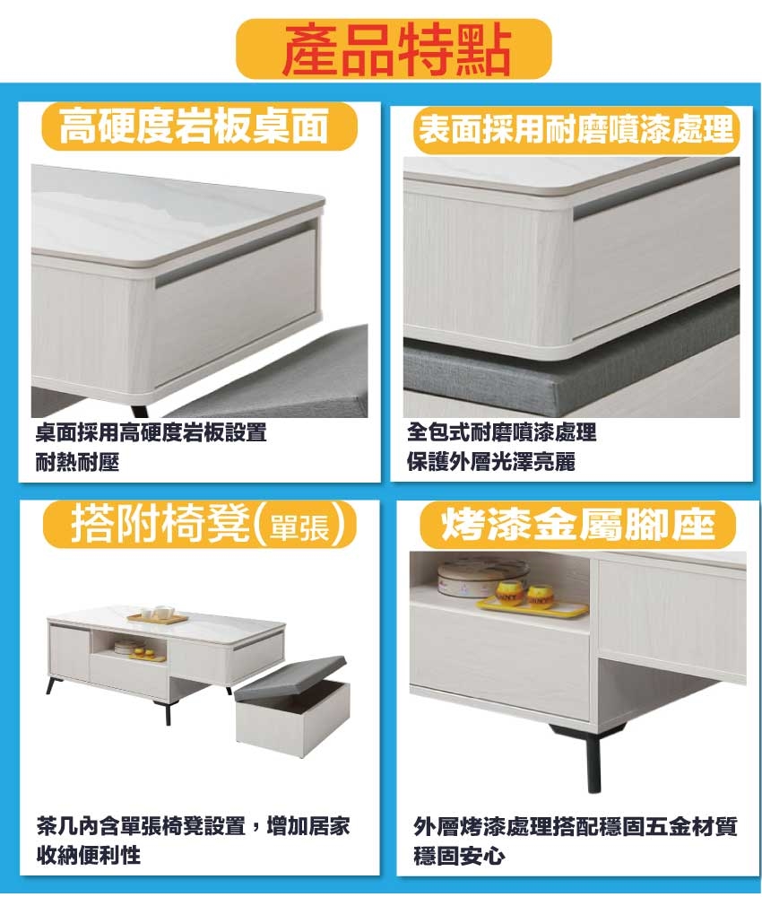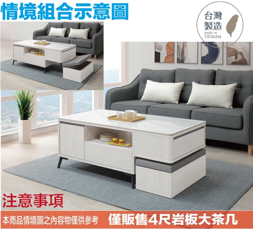 - ◆產品名稱:【綠家居】米克瑞4尺岩板開門二抽大茶几(附收納椅凳單張)
