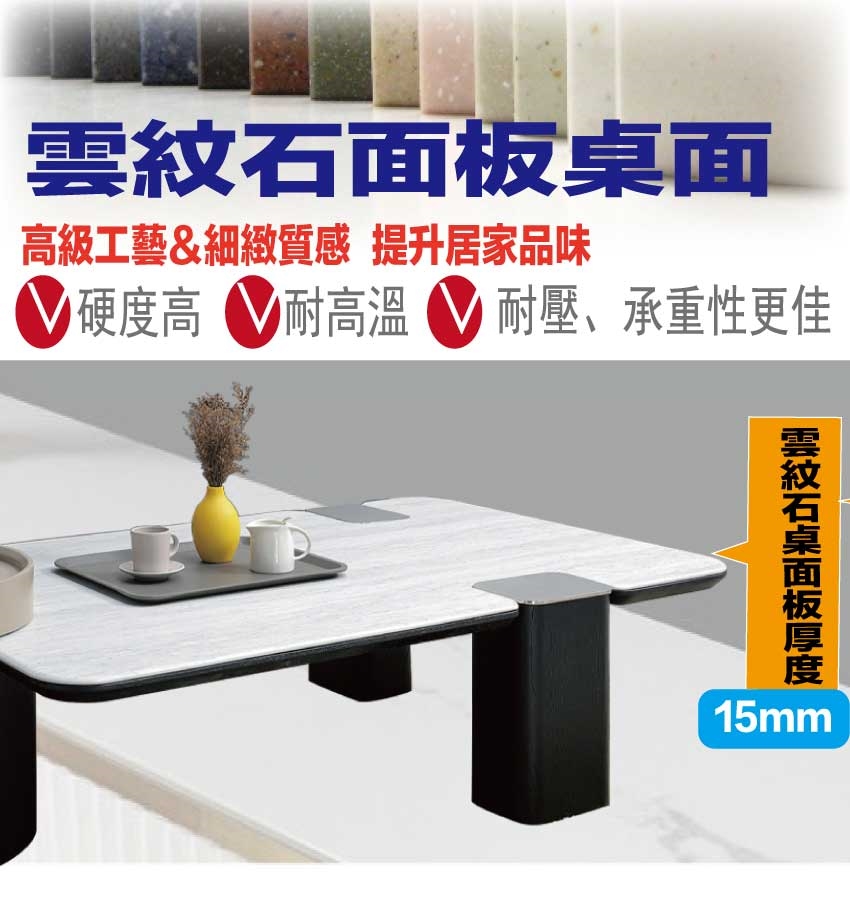 採用防潮MDF板+防潮耐磨底座+15mm雲紋石面桌面板等安心材質製造