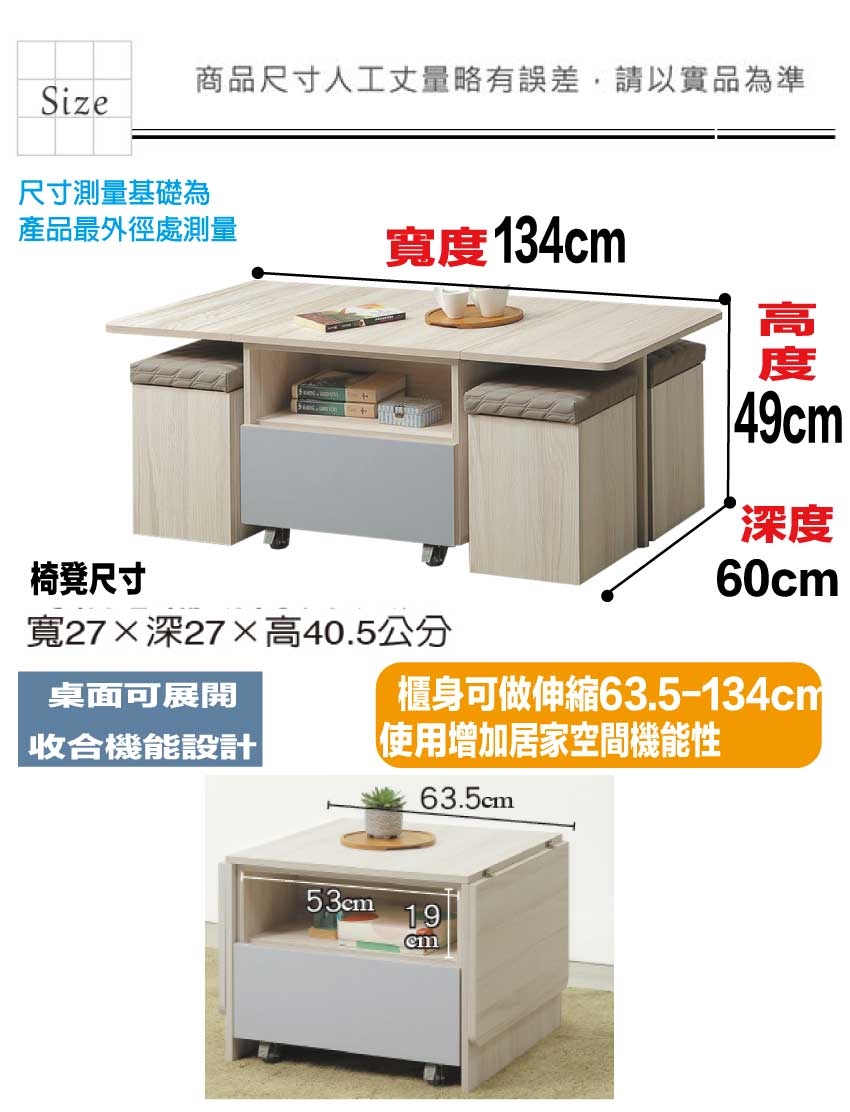 展開茶几尺寸:(寬)134x(深)60x(高)49/公分