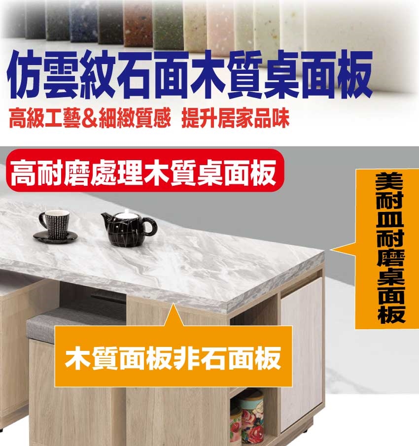 材質:防蛀木心板+五金滑軌結構+防刮耐磨腳座+仿石紋耐磨美耐皿材質桌面板