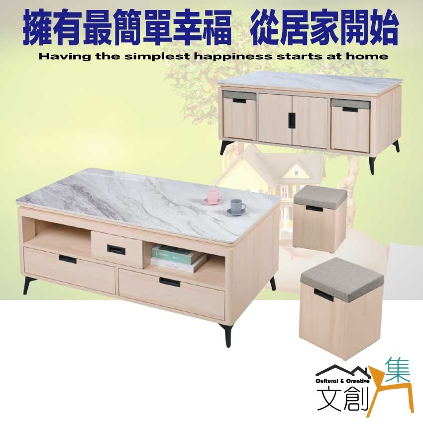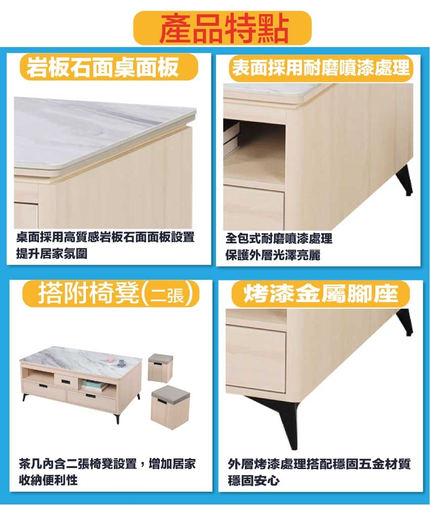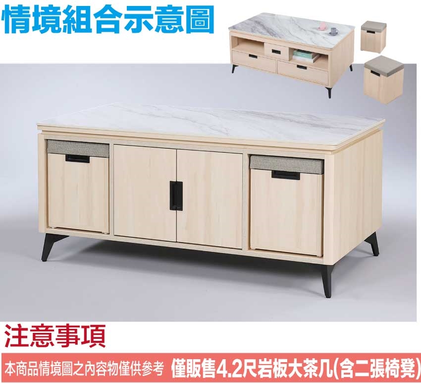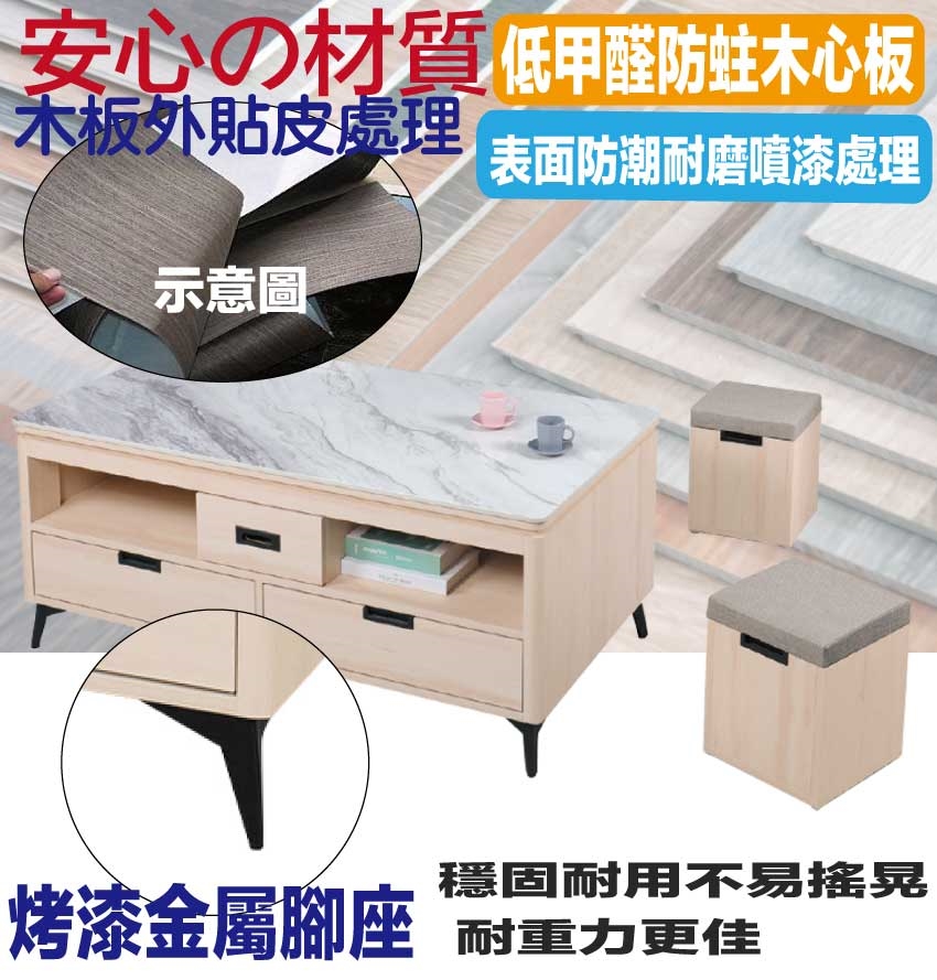 - ◆產品名稱:【綠家居】力斯雙色4.2尺三抽岩板大茶几(附二張椅凳)