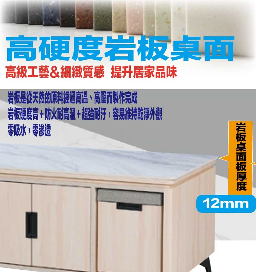 材質:防蛀木心板+五金滑軌結構+烤漆五金腳座+12mm高硬度岩板桌面板
