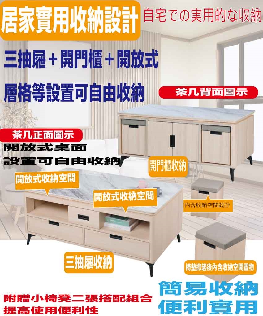 搭配採用開門櫃+三抽屜+開放層格+附二張椅凳等收納空間設計