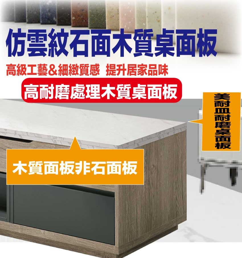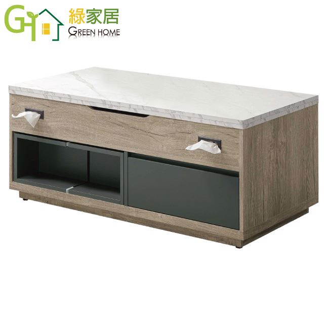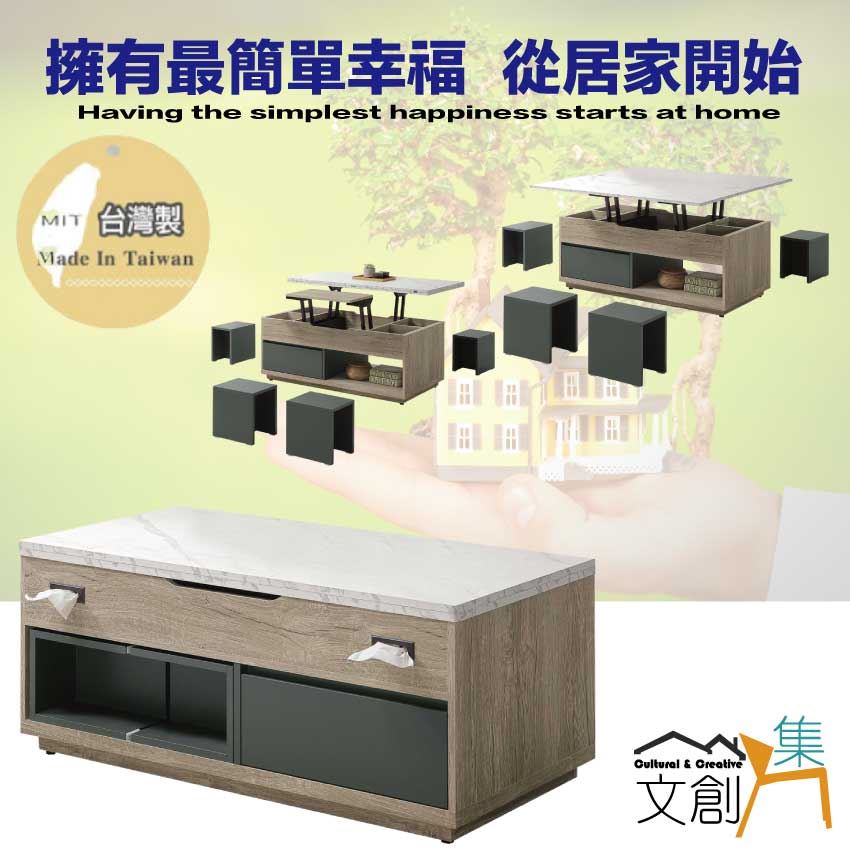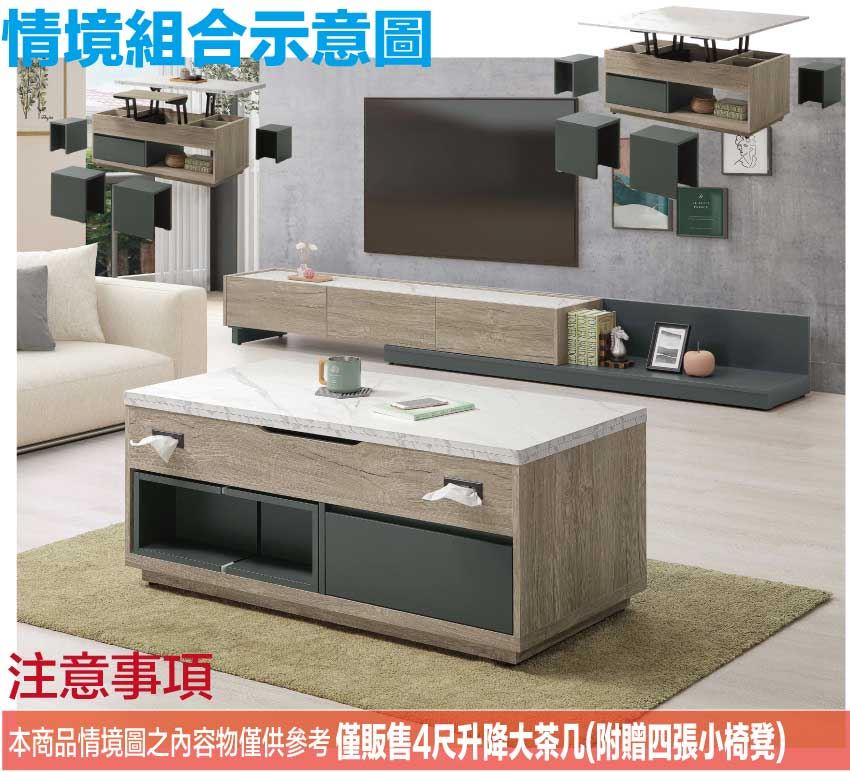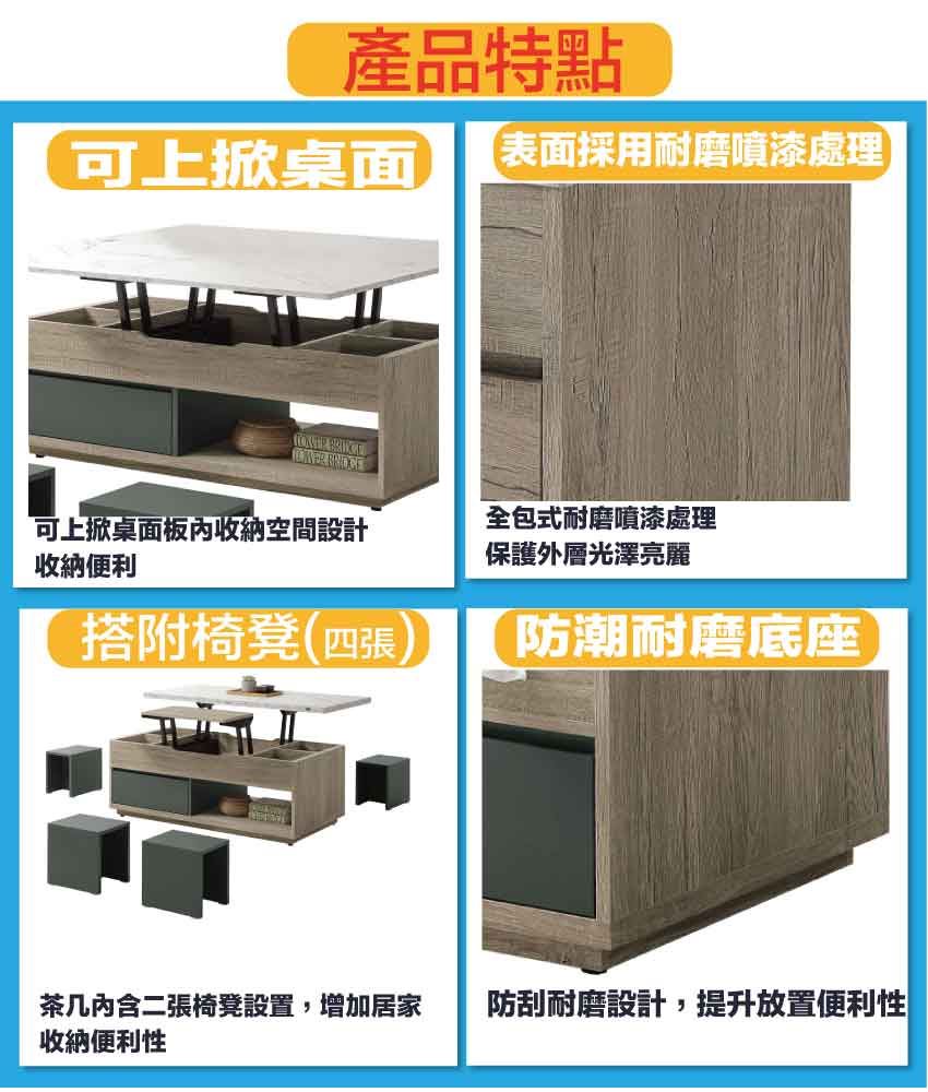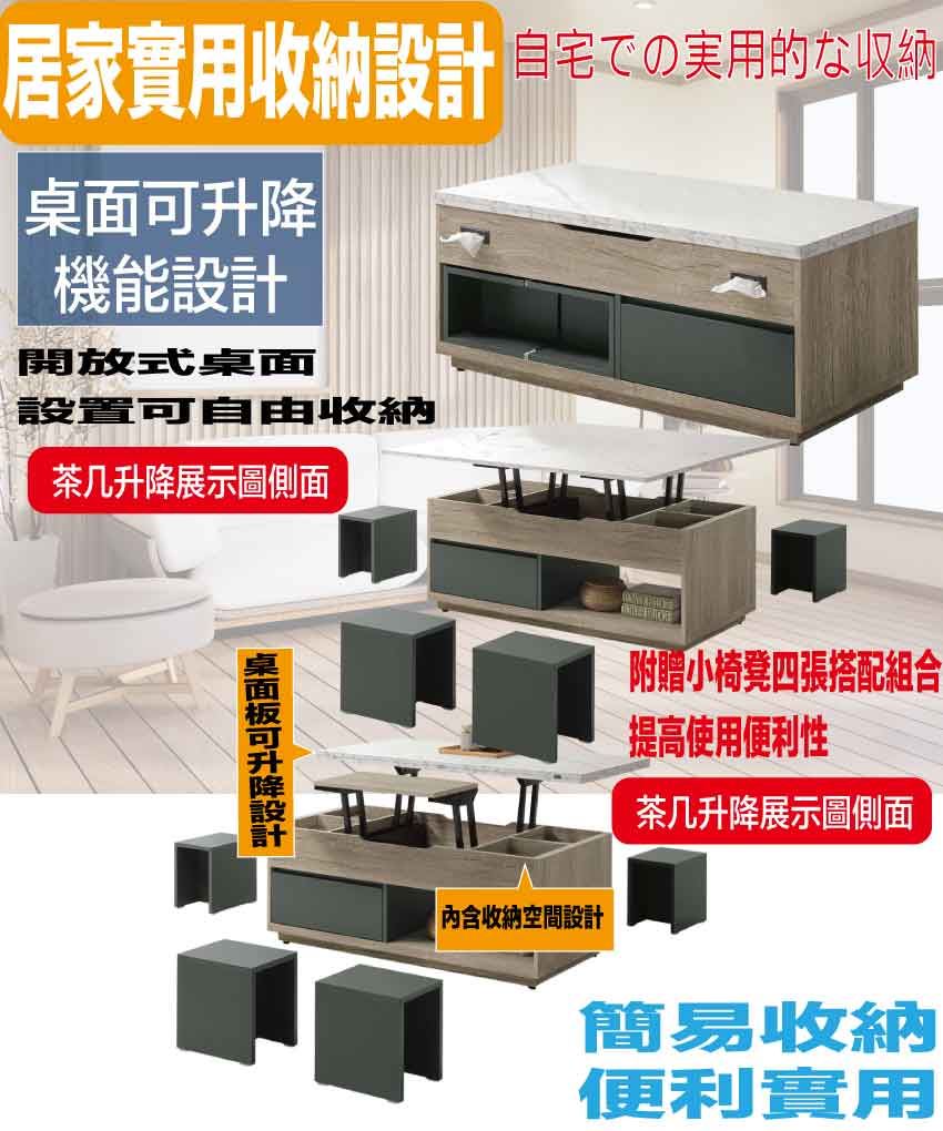 - ◆產品名稱:【綠家居】華卡雙色4尺仿石紋大茶几組合(桌面可升降+收納椅凳四張)