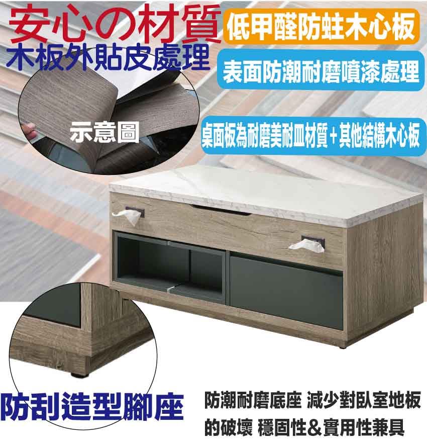 採用防蛀木心板+防潮耐磨底座+五金滑軌結構+升降五金結構+仿大理石紋耐磨美耐皿材質桌面板等安心材質製造