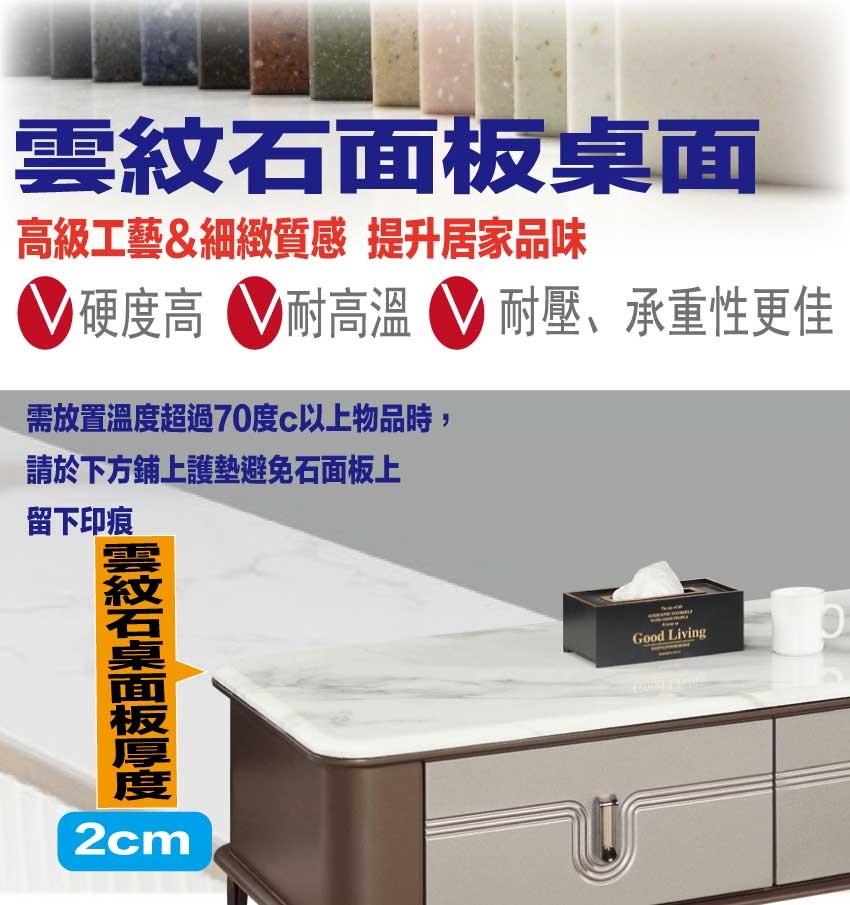 採用防潮MDF板+烤漆鐵製腳座+五金滑軌結構+2cm雲紋石面桌面板等安心材質製造