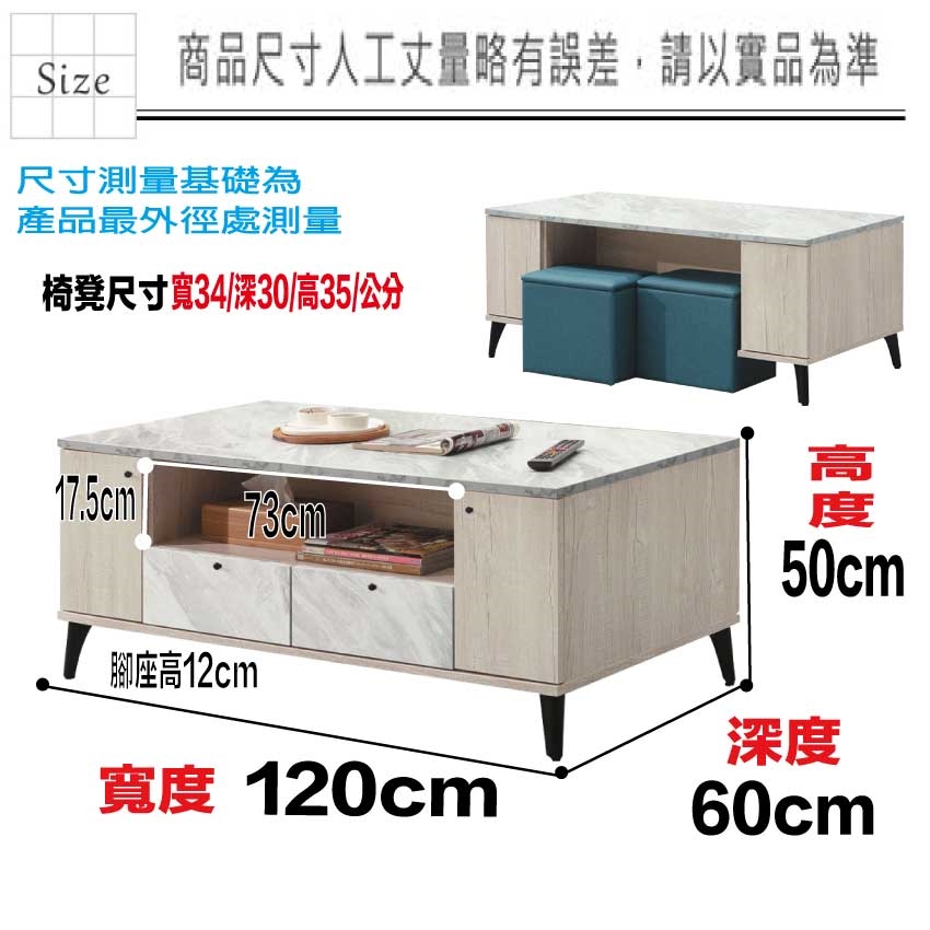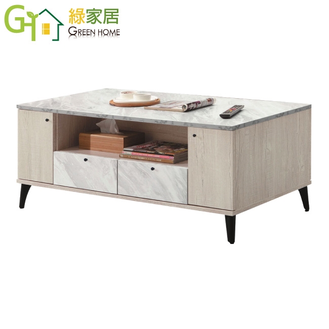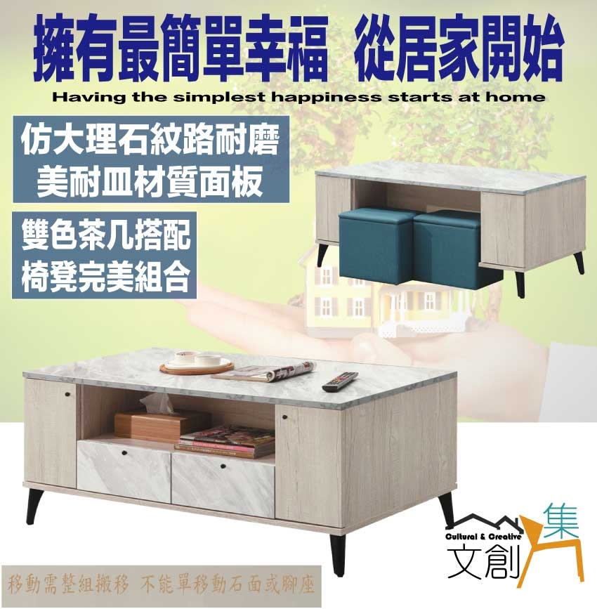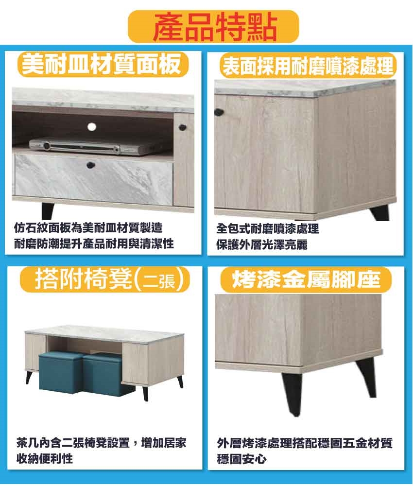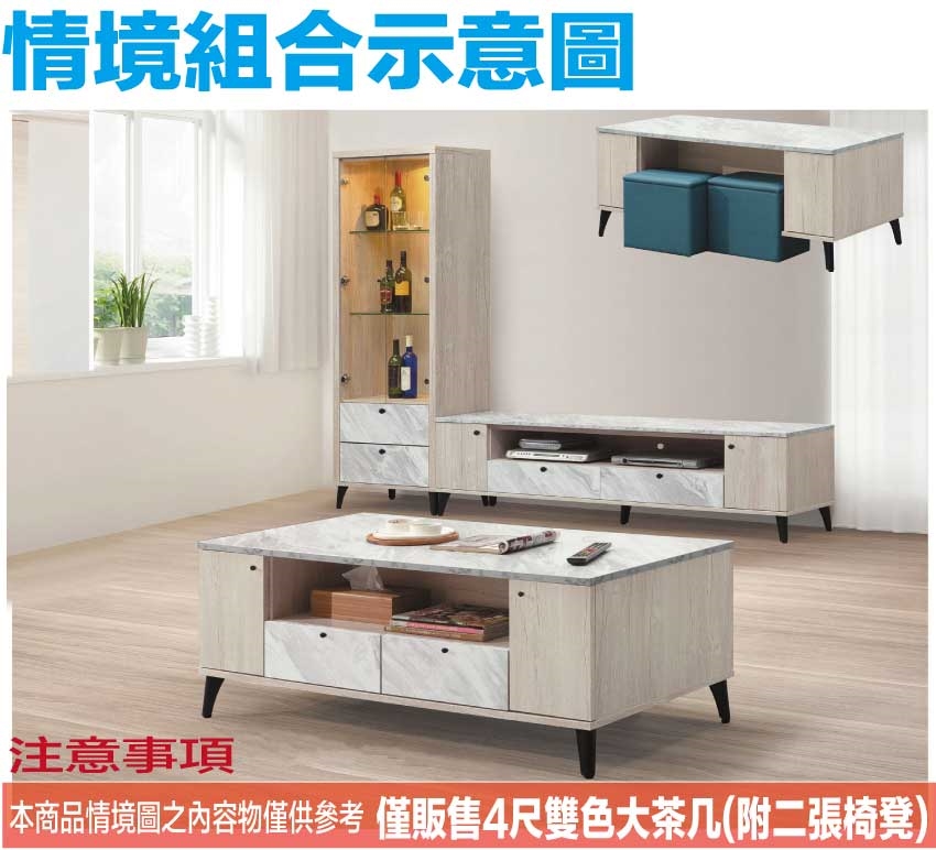 - ◆產品名稱:【綠家居】瑪西4尺二門二抽大茶几(耐磨美耐皿面板+附贈二張可收納椅凳)
