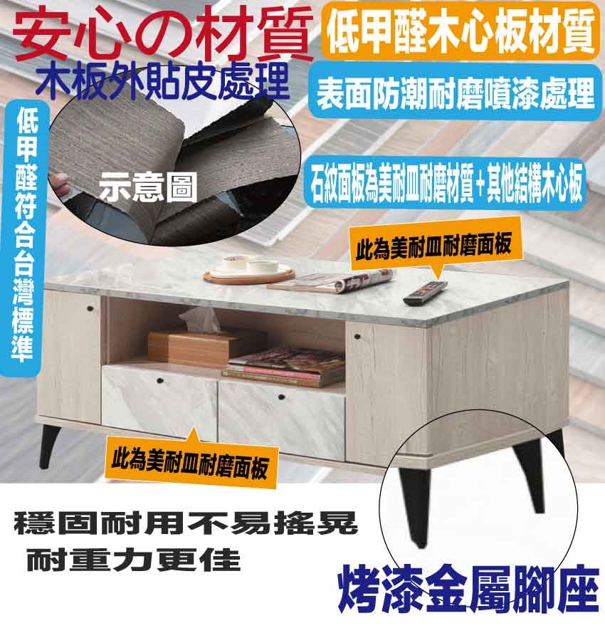 防蛀木心板+烤漆金屬腳座+仿大理石紋路耐磨美耐皿面板等安心材質製造