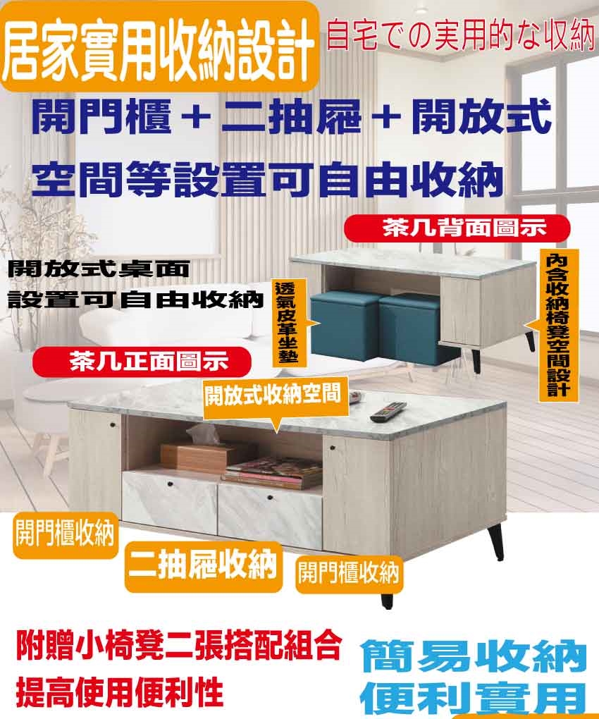 採用開門櫃+二抽屜+內&外開放層格+附贈二張可收納椅凳等收納空間設計