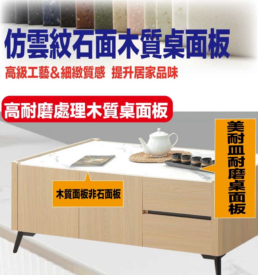 材質:防蛀木心板+烤漆金屬腳座+仿大理石紋路耐磨美耐皿面板 -