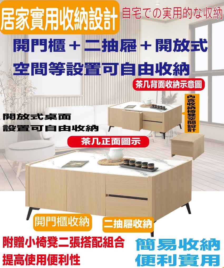 採用開門櫃+二抽屜+內開放層格+附贈單張椅凳等收納空間設計