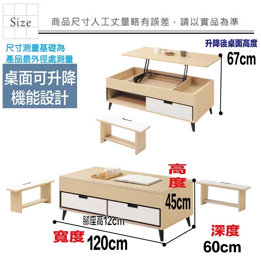 ★偏遠地區需額外加收運費,下標請先問與答詢問★ ★下訂前注意 由於商品流動較快,下訂前請先詢問是否有貨在下訂喔~★ 【綠家居】摩卡雙色4尺升降機能大茶几(桌面可升降+收納椅凳二張) 木紋雙色系+現代簡約風格+安心材質製造,使用放心+搭配居家更便利,整體採用防蛀木心板+烤漆金屬腳座+升降五金結構等安心材質製造搭配外層採用防潮耐磨噴漆處理 ,採用收納椅凳二張+二抽屜+內&外開放層格等收納空間設計,全由專人配送到家,專業安心服務,替你省下更多時間!