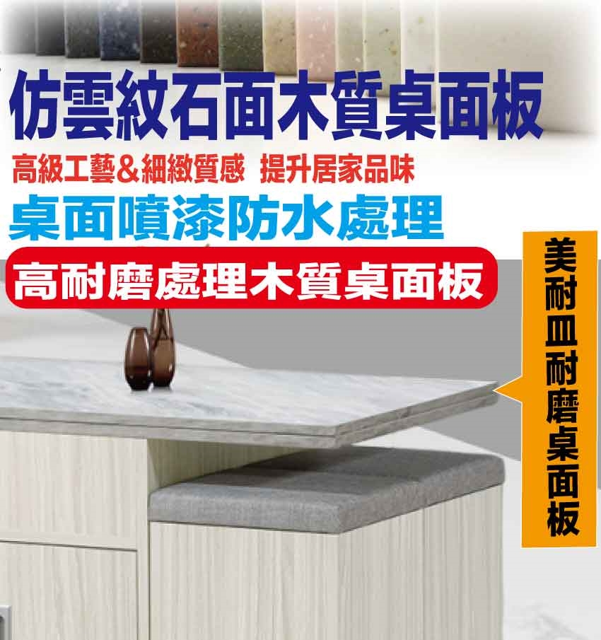 材質:防蛀木心板+防潮耐磨底座(可調高低水平)+美耐皿耐磨仿石紋桌面板+升降五金結構