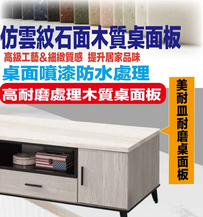 材質:防蛀木心板+烤漆金屬腳座+美耐皿耐磨仿石紋桌面板