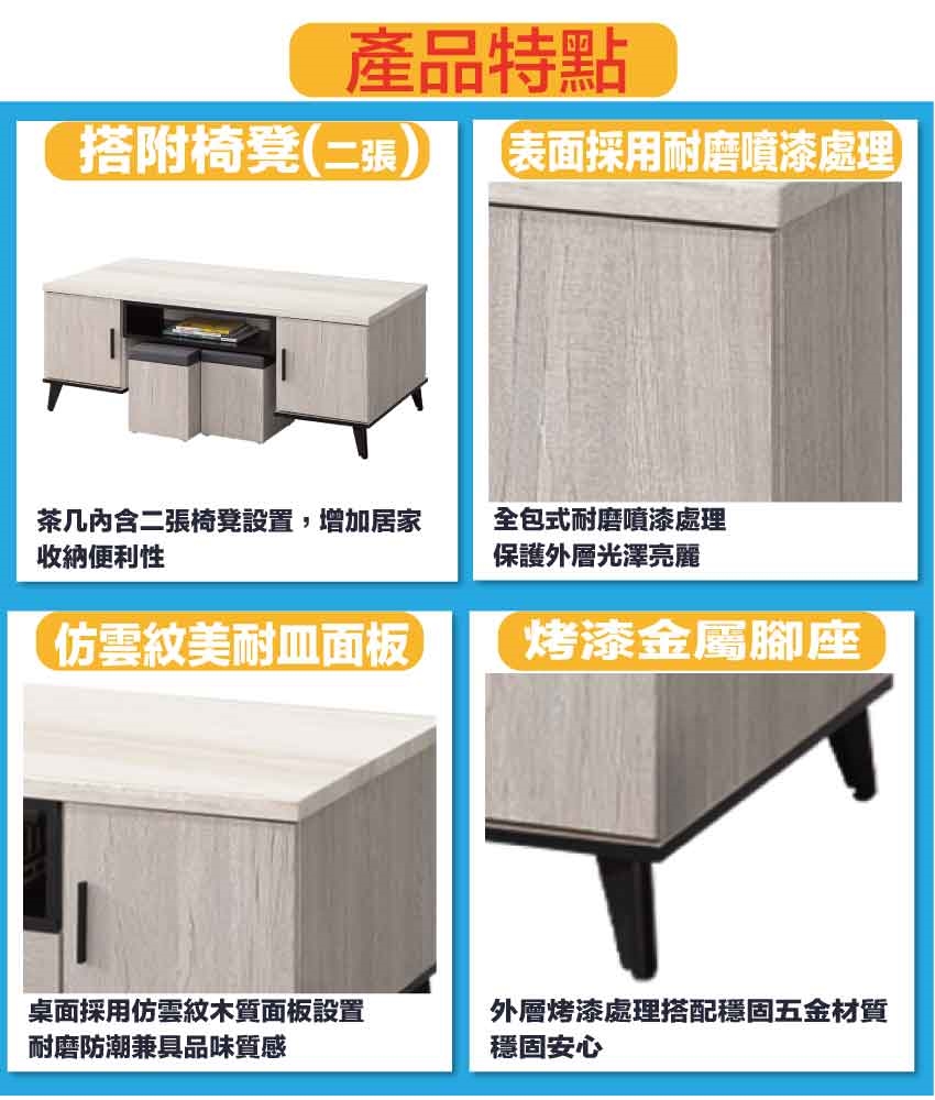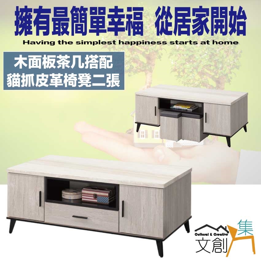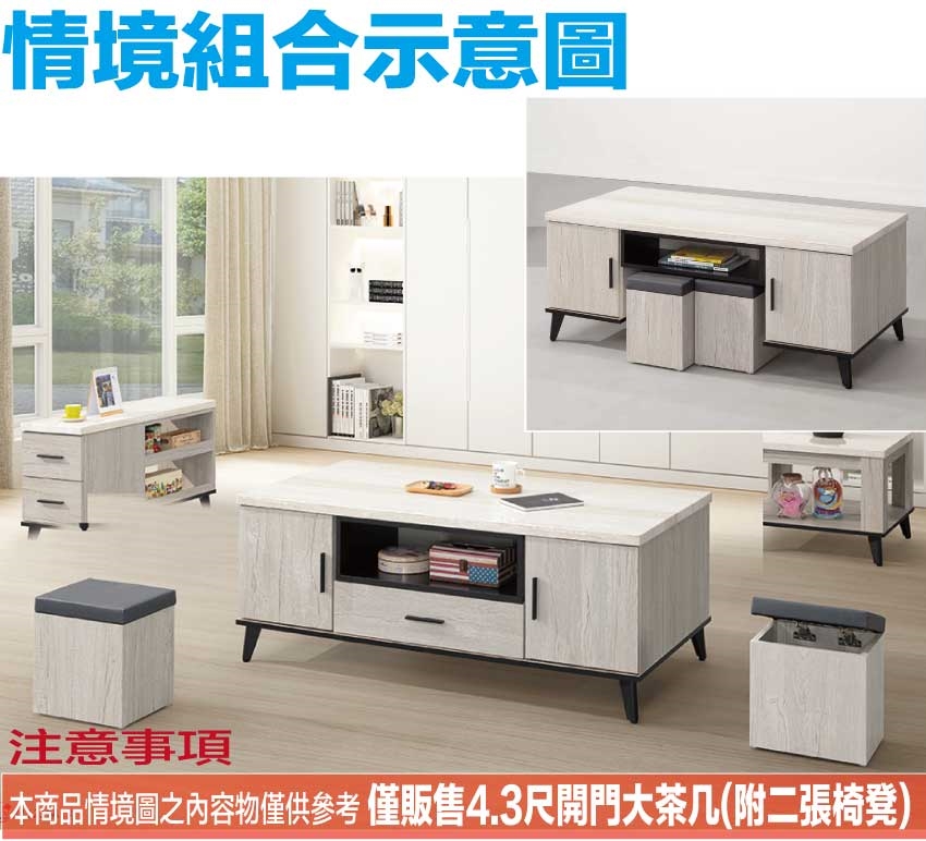 - 產品名稱:【綠家居】凱曼雙色4.3尺四門單抽大茶几(附贈可收納椅凳二張)