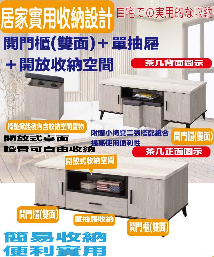 採用開門櫃(雙面開合)+單抽屜+開放式層格&桌面+附贈可收納椅凳二張等收納空間設計