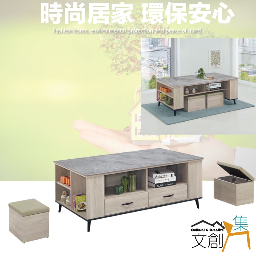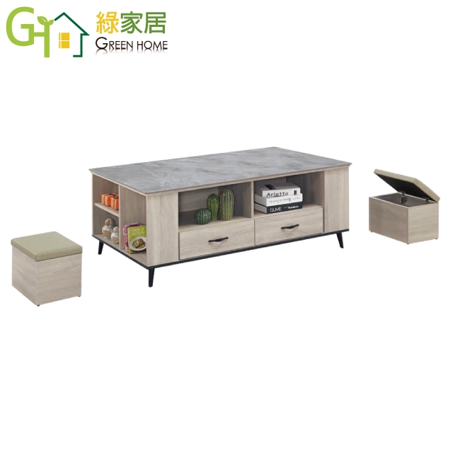 【綠家居】瑞凡灰橡紋5尺岩板二抽大茶几(附收納椅凳二張)