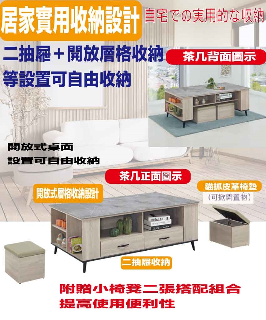 搭配採用二抽屜+開放層格+可收納小椅凳二張等收納空間設計