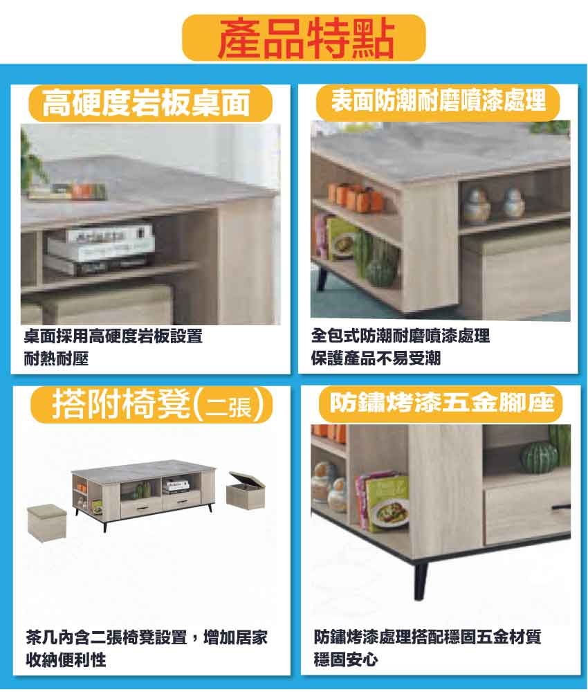 ★偏遠地區需額外加收運費,下標請先問與答詢問★ ★下訂前注意 由於商品流動較快,下訂前請先詢問是否有貨在下訂喔~★ 【綠家居】瑞凡灰橡紋5尺岩板二抽大茶几(附收納椅凳二張) 灰橡木紋色系+安心材質製造,使用放心+搭配居家更便利,採用防蛀木心板+烤漆金屬腳座+五金滑軌結構+12mm高硬度岩板桌面板等安心材質製造 ,外層採用防潮耐磨噴漆處理搭配採用二抽屜+開放層格+可收納小椅凳二張等收納空間設計,全由專人配送到家,專業安心服務,替你省下更多時間!