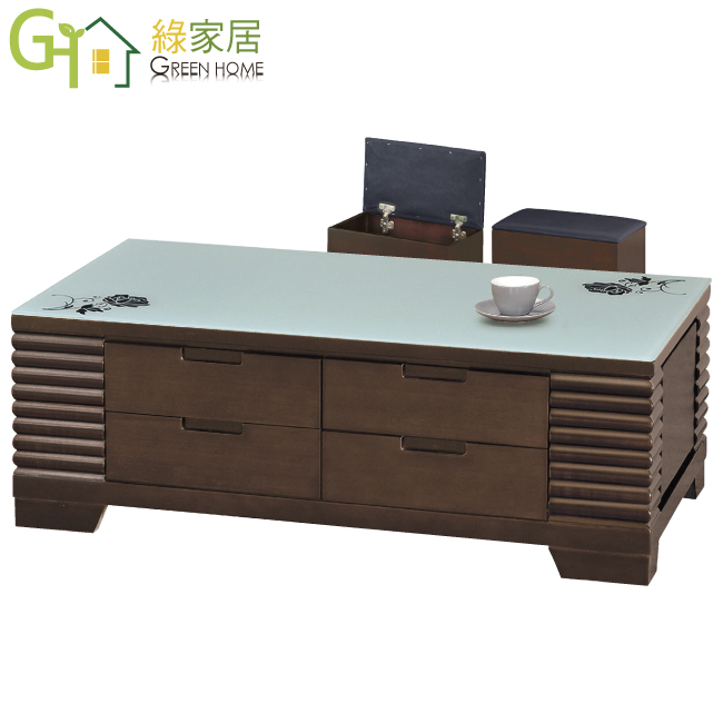【綠家居】奎德 胡桃木紋4.3尺玻璃大茶几(附贈收納椅凳二張) 充滿雅緻風格的造型線條,高雅外觀提升居家雅緻品味,能輕鬆地融入各種空間風格,更顯一番氣質。茶几為四抽屜分層收納結構,讓您不必再頭痛地整理桌上的瓶瓶罐罐;茶几材質採用松木實木+防蛀木心板材質+優利坦抗磨三層全包式塗漆處理+5mm高硬度強化玻璃+五金把手+可收納椅凳二張等搭配設計讓您不再煩惱耐用性,尺寸符合現在小宅空間所需,時尚且實用便利的設計,即使身在都市的喧囂鬧區,只要回到了家,就彷彿進入心中的一方小空間 【綠家居】奎德 胡桃木紋4.3尺玻璃大茶几(附贈收納椅凳二張) 可千萬別錯過喔!現在購買專人送到府服務,免組裝+免運費,讓你省時省力省運費!