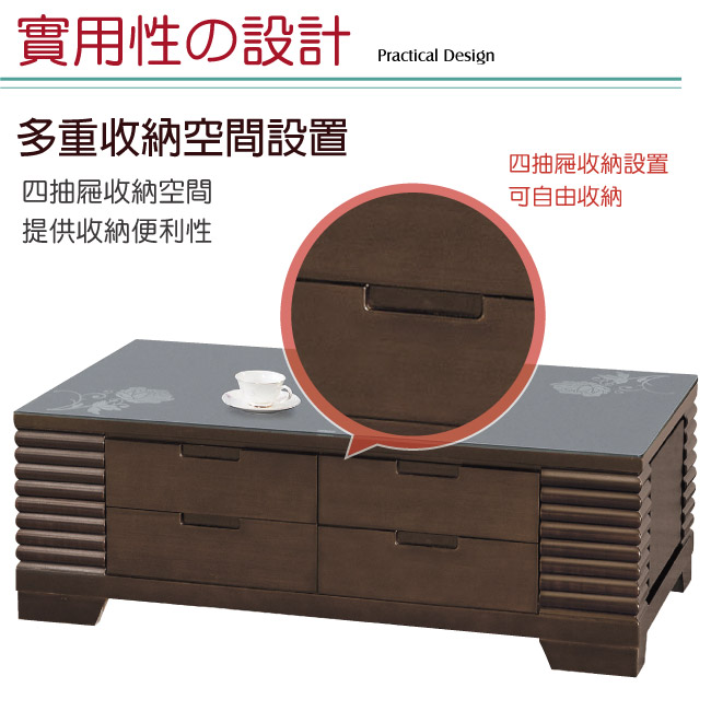 【綠家居】奎德 胡桃木紋4.3尺黑玻大茶几(附贈收納椅凳二張) 充滿雅緻風格的造型線條,高雅外觀提升居家雅緻品味,能輕鬆地融入各種空間風格,更顯一番氣質。茶几為四抽屜分層收納結構,讓您不必再頭痛地整理桌上的瓶瓶罐罐;茶几材質採用松木實木+防蛀木心板材質+優利坦抗磨三層全包式塗漆處理+5mm高硬度強化黑色玻璃+五金把手+可收納椅凳二張等搭配設計讓您不再煩惱耐用性,尺寸符合現在小宅空間所需,時尚且實用便利的設計,即使身在都市的喧囂鬧區,只要回到了家,就彷彿進入心中的一方小空間 【綠家居】奎德 胡桃木紋4.3尺黑玻大茶几(附贈收納椅凳二張) 可千萬別錯過喔!現在購買專人送到府服務,免組裝+免運費,讓你省時省力省運費!