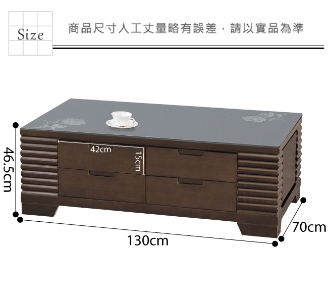 產品名稱:【綠家居】奎德 胡桃木紋4.3尺黑玻大茶几(附贈收納椅凳二張) 產品尺寸: 茶几:(寬)130x (深)70x(高)46.5/ 公分 材質:松木實木+防蛀木心板 塗漆:優利坦塗漆耐磨處裡 背板:美背處理 滑軌:鋼珠滑軌 面板:5mm高硬度強化黑色玻璃商品編號 | 尺寸 | 顏色 | 組裝方式 |