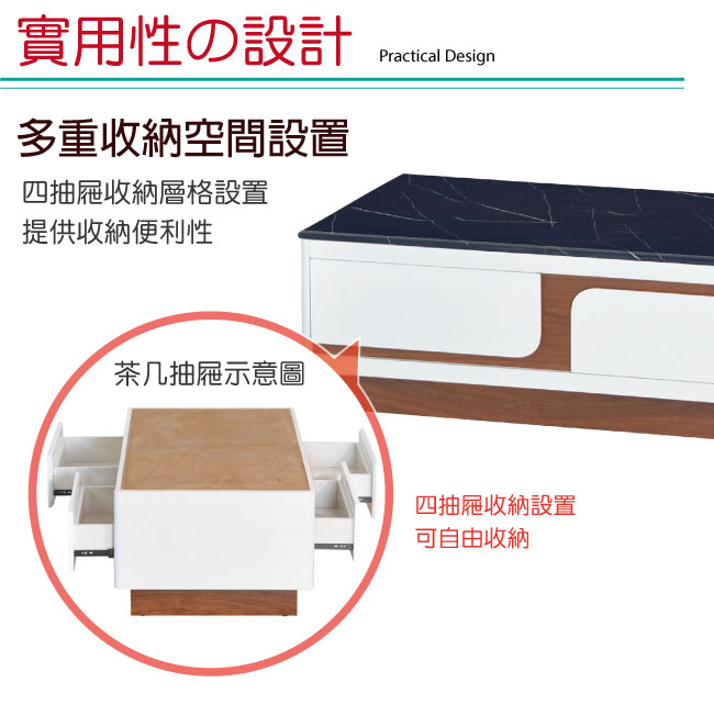 【綠家居】南亞 白色4尺雲紋石面大茶几 充滿雅緻風格的造型線條,高雅外觀提升居家雅緻品味,能輕鬆地融入各種空間風格,更顯一番氣質。茶几為開放式收納+四抽屜等多收納結構,讓您不必再頭痛地整理桌上的瓶瓶罐罐;茶几材質採用防潮MDF材質+優利坦抗磨三層全包式塗漆處理+2cm雲紋石面板+內崁式把手+鋼珠滑軌等搭配設計讓您不再煩惱耐用性,尺寸符合現在小宅空間所需,時尚且實用便利的設計,即使身在都市的喧囂鬧區,只要回到了家,就彷彿進入心中的一方小空間 【綠家居】南亞 白色4尺雲紋石面大茶几 可千萬別錯過喔!現在購買專人送到府服務,免組裝+免運費,讓你省時省力省運費!
