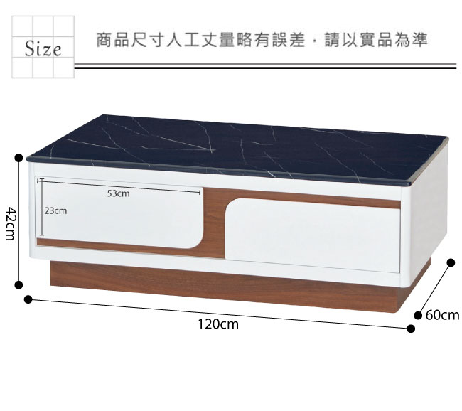 產品名稱:【綠家居】南亞 時尚4尺雲紋石面大茶几 產品尺寸: 茶几:(寬)120x (深)60x(高)42/ 公分 材質:防蛀木心板 塗漆:優利坦塗漆耐磨處裡 背板:美背處理 滑軌:鋼珠滑軌 面板:2cm雲紋石面板商品編號 | 尺寸 | 顏色 | 組裝方式 |