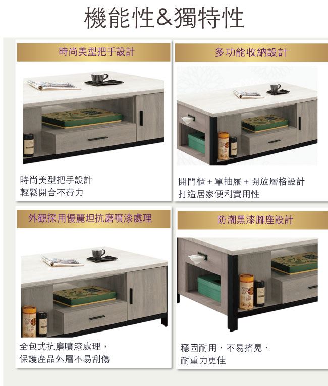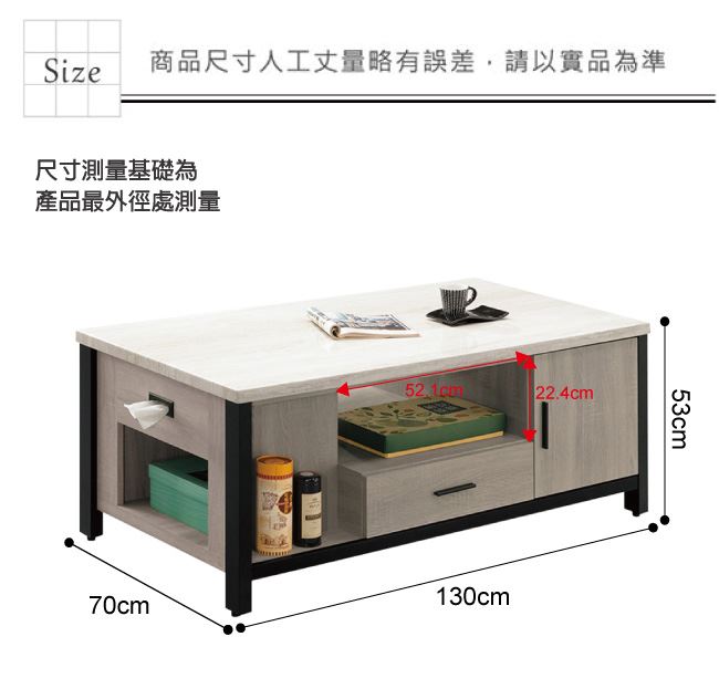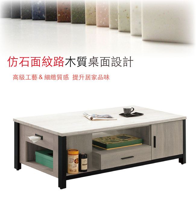 材質 | ◆產品名稱:【綠家居】 伊格 時尚4.3尺仿雲紋木質大茶几 尺寸:(寬)130x(深)70x(高)53/公分 ◆材質: 材質:防蛀木心板+五金滑軌結構+仿雲紋石面紋路木質桌面板 |